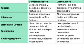 Comercializadora: El usuario puede contactar a la comercializadora para contratar o cambiar de tarifa, para aclarar dudas sobre la factura o hacer una reclamación por cobros o datos incorrectos en su factura