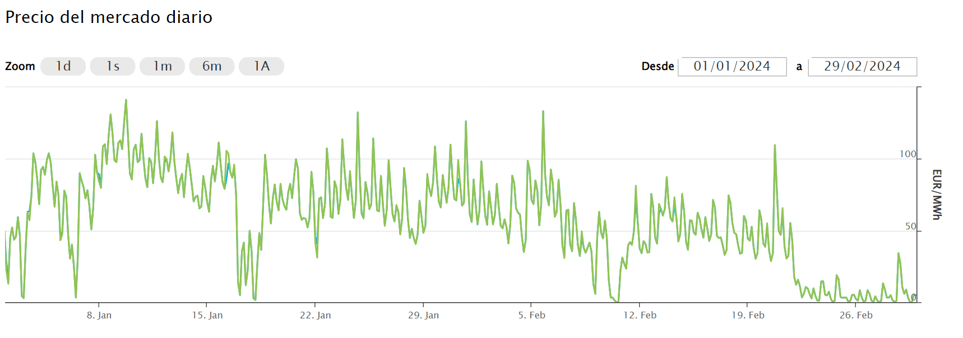 Como se puede observar en el gráfico de OMIE (Operador del Mercado Ibérico de la Energía), el precio mayorista a finales de Febrero se redujo considerablemente por debajo de los 45MWh por lo que en la factura de Marzo el IVA será del 21%.