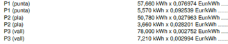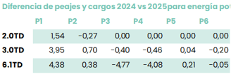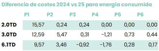 Primero de todo en la siguiente tabla encontrarás el diferencial de los antiguos costes con los nuevos costes de 2025 para la parte de consumo energético: