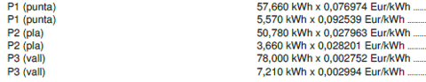 Como se puede observar, se tienen diferentes cargos a diferentes precios por cada periodo de consumo: punta, llano y valle. Esto es porque la comercializadora ha facturado los días de diciembre a los costes de 2024 y los días de enero a los nuevos costes regulados. Como se observa en la imagen, algunos suben bastante y otros bajan un poco.